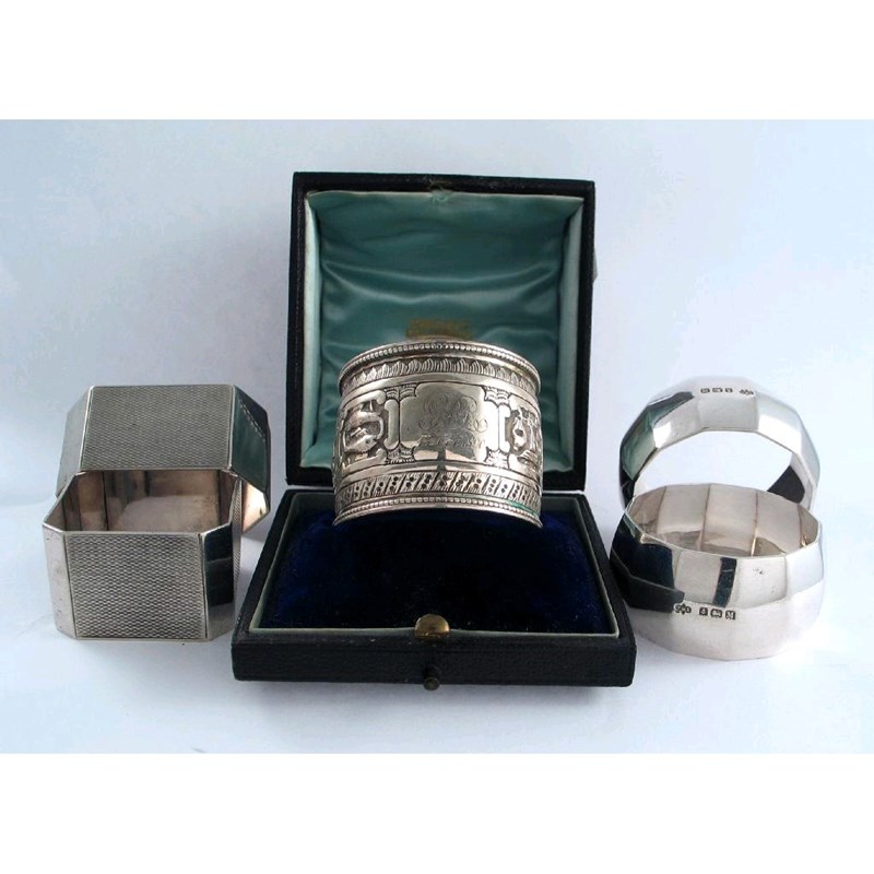 Three boxes containing napkin rings: a pair of modern faceted examples