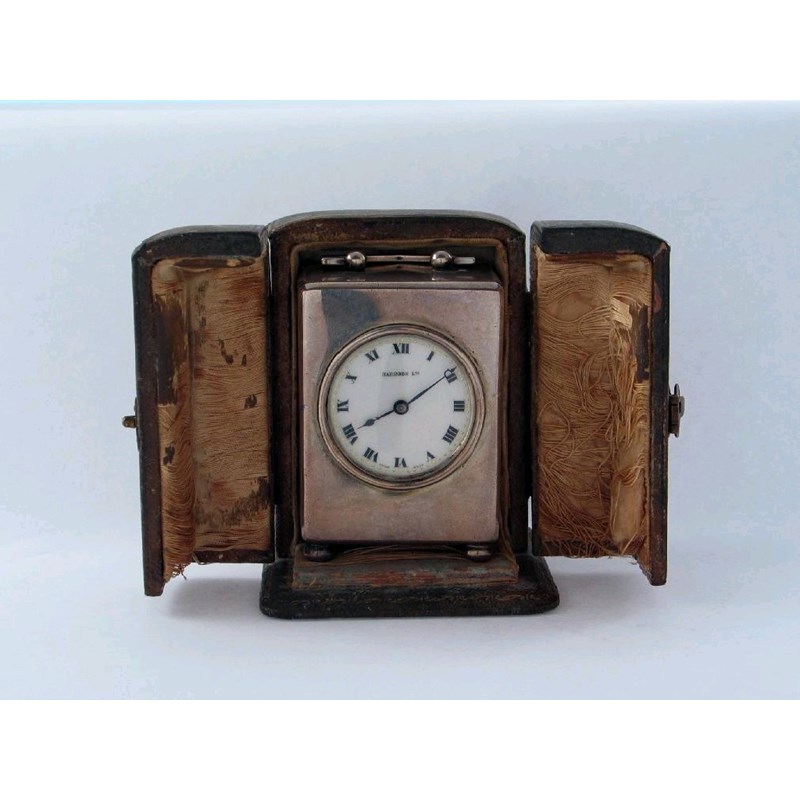 A modern carriage timepiece, of plain oblong form on button feet and a swing handle, the white enamelled dial with black Roman numerals, titled "Harrods Ltd", maker's mark "RWB", London 1920 (in original fitted case), 3.25in (8.2cm) high.
