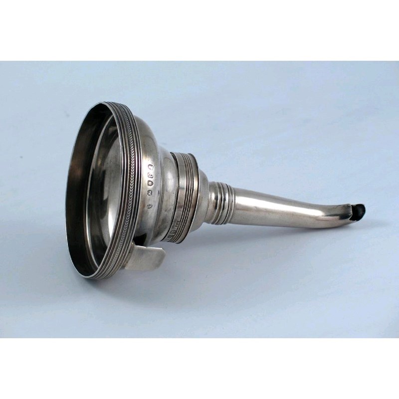 A George III wine funnel, with a reed and braided rim and a tapering spout, by Solomon Hougham, Solomon Royes & John East Dix, London 1817, 5.1in (13cm) high, 3oz.