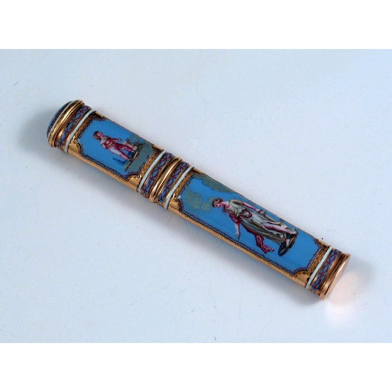 An early 19th century gold and enamelled sealing wax case, decorated with bright-cutting and four painted panels each depicting a figure against a light powder blue ground (some restoration). Struck with a foliate makers mark (thrice) and French duty marks, 4.3in, (11cm) high, probably Swiss c.1800.