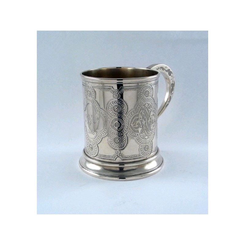 A Victorian engraved mug, cylindrical with a shifted base and feintly gilt interior, initialled and dated 1860, by GR Elkington, London 1859, 3.4in (8.6cm), 6.5oz.