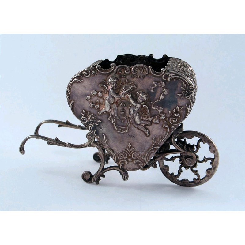 A late 19th century continental novelty box, in the form of a stylised wheelbarrow with a heart shaped hopper, by B. Muller, with English import marks for London 1895, 5in (12.5cm) long, 3.5oz.