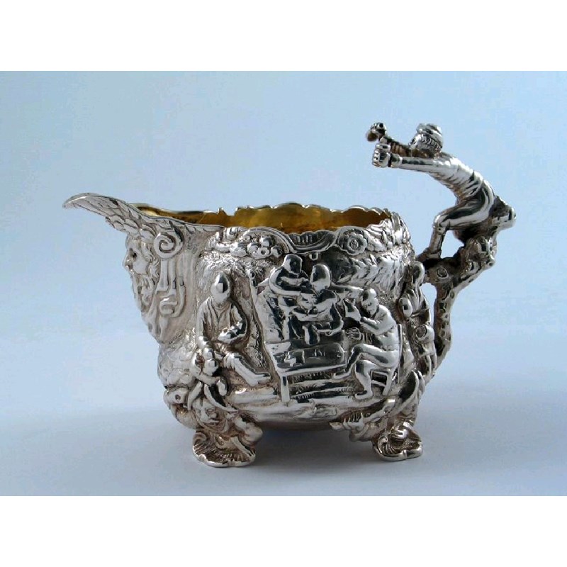 A George IV cast cream jug, on four charicture mask feet profusely decorated around the sides with scenes in relief from 17th century peasant life, mask spout, handle cast of a boy pouring condiments over the rim, by Edward Farrell, London 1829 (gilt interior), 4.25in (10.8cm) high, 14oz.