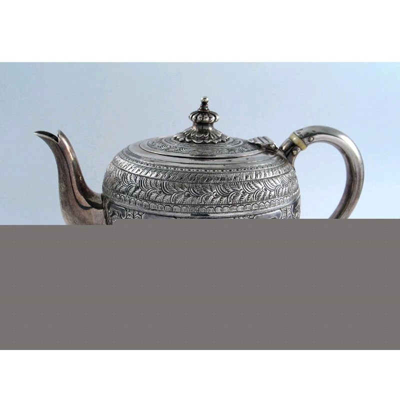 A Victorian bachelor's teapot, of squat circular form with a ribbed knop finial, the body profusely chased and decorated with panels emblematic of the signs of the zodiac and two vacant cartouches, by George Fox, London 1875, (contained in a fitted mahogany case with key), 3.5in (9cm) high, 7.5oz.