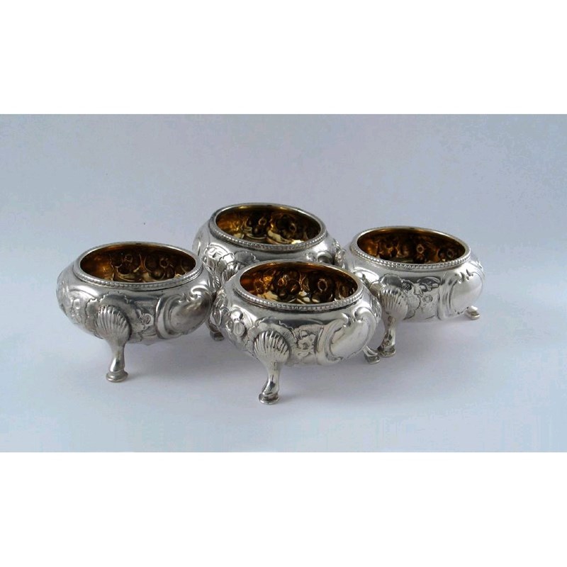 A set of four Victorian embossed salts, on three feet, gilt interiors, by Edward Ker Reid, London 1869, 2.25in (5.5cm) diameter, 5oz.