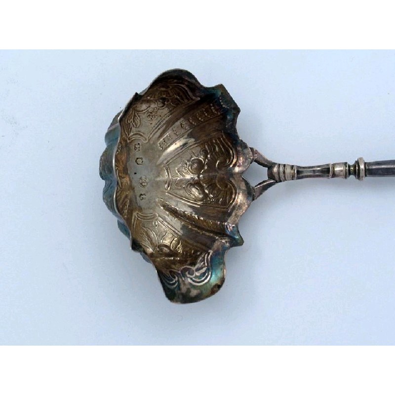 A George II punch ladle, with a shaped single lipped bowl, embossed with panels of fruit, with a bifocated stem and a whale bone handle, by an unidentified maker IW (Grimawade No 3693) London 1754, 17.5in (44.5cm)