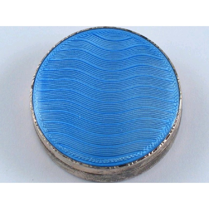 A modern circular pill box, with a pull-off, blue enamelled cover, by W. Neale Ltd, Birmingham 1936, 1.5in (3.8cm) diameter.