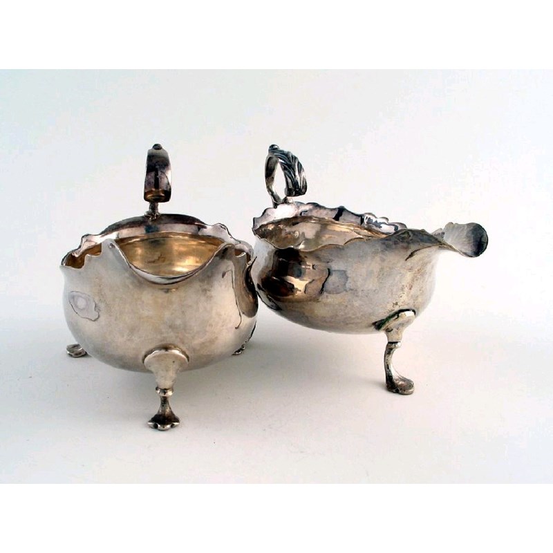 Two similar George III sauceboats , of bellied oval form, with flying scroll handles, on three legs, one initialled `I * H', by John Muns, London 1762, the other with worn maker's mark, London 1774, 4.5in (11.3cm) max, 6.5oz. (2)