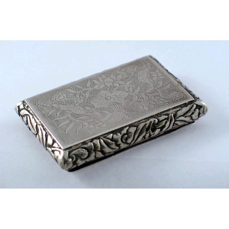 A mid 19th century Chinese Export snuff box, with florally engraved cover and base and chased convex sides. Maker's mark of Knee CHong (with Chinese character mark) 1850-60, 24' (6cm) 1.5oz.