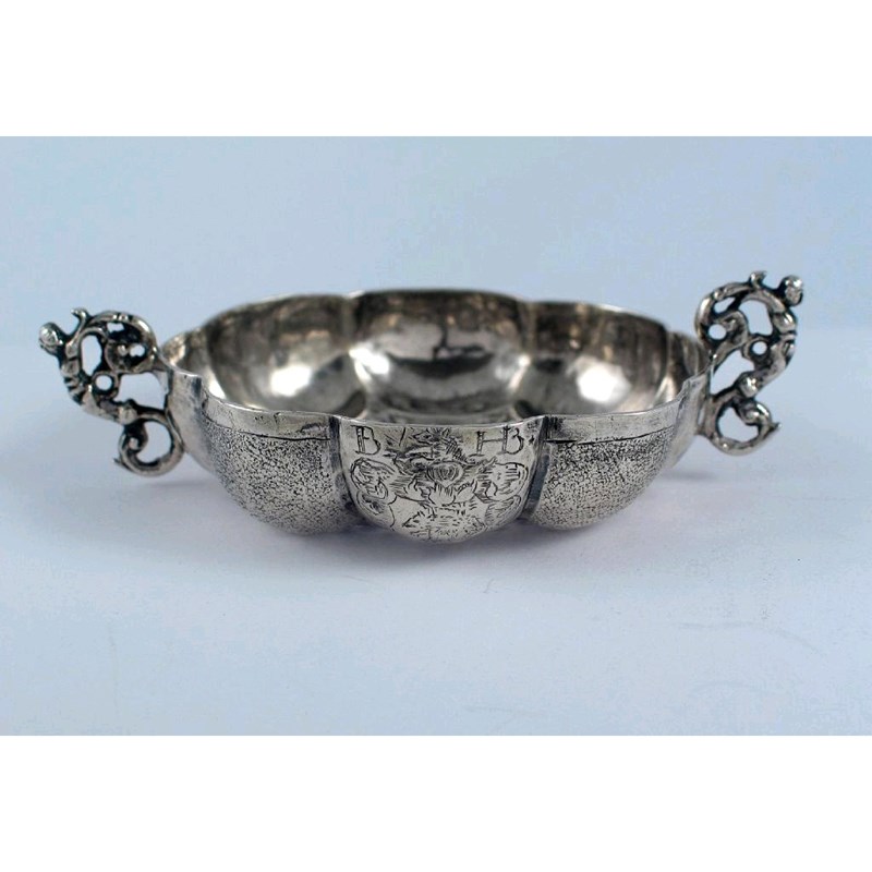 A 17th century lobed circular wine taster or sweetmeat dish, with two scroll handles, part polished and part matt decoration, engraved on one side with a coat of arms and dated "1658" on the other, unmarked, probably Dutch mid 17th century, 4.25in (10.6cm) wide overall, 1.25oz.