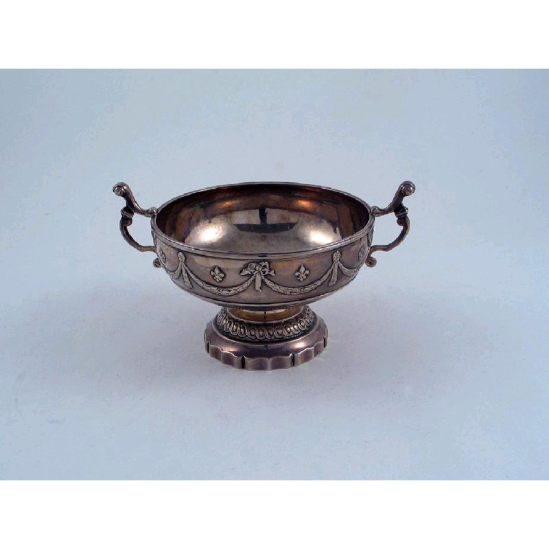 A 19th century French marriage bowl, with a shaped pedestal foot, two harp-shaped handles, a central inset medallion and a frieze of festoons around the bowl, inscribed "de MAGNY", with pseudo marks, second half of the 19th century, 5" (13cm) diameter, 10oz.