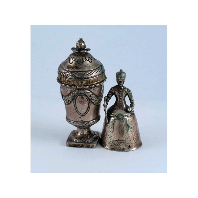 A Scandinavian hovedvansaeg, of vase form with parcel gilding a hinged base and cover and a bud finial, maker's mark only "KN" struck twice, unascribed, probably Danish/Norwegian early 19th century, together with a 19th century Dutch miniature bell in the form of a lady in a crinoline dress, (lacking clacker) the hovedvansaeg 3in (7.5cm) high, 2oz. (2)