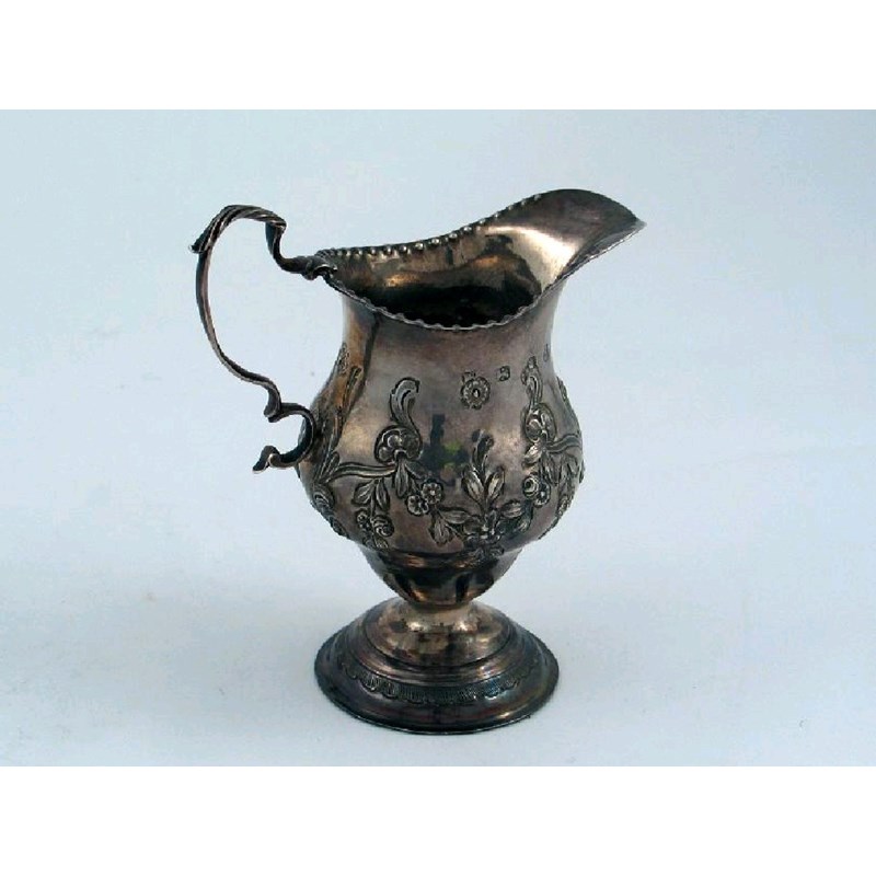 A George III baluster cream jug on a circular domed foot, with a punch-beaded rim and embossed floral festoons, initialled "WME", maker's mark lost in a floral roundel, London 1779, 4.5in (11.5cm) high, 3oz.