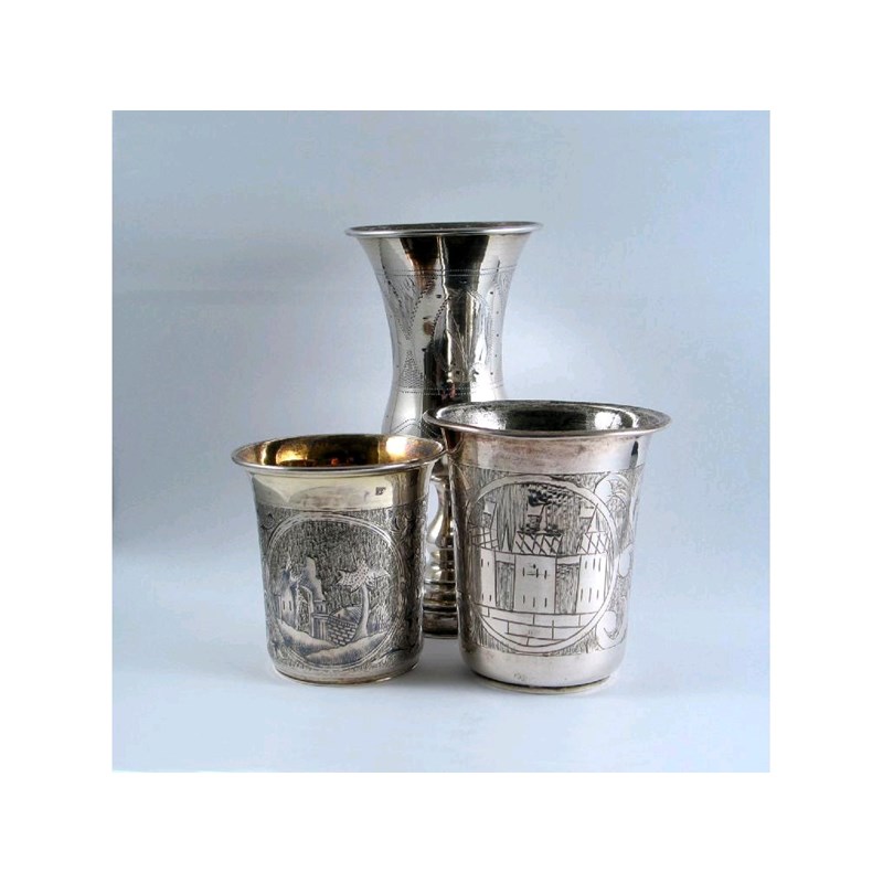 An engraved Kiddish cup London 1903 and two late 19th century Russian beakers: one engraved with architectural scenes, the other with niellwork, mixed makers and dates, 8oz. (3)