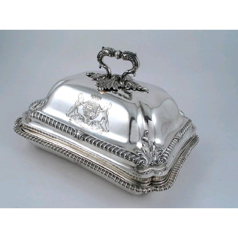 A set of four George IV cushion shaped entree dishes, with incurved corners, high domed covers and gadrooned borders, further decorated at each corner with a chased acanthus leaf, detachable cast foliate handles, the bases crested, the covers crested and engraved with a coat of arms *, by Paul Storr, London 1822, stamped underneath with "Storr & Mortimer New Bond Street", 11.5in (29.2cm) wide, 7in (17.8cm ) high, 277oz. (4)