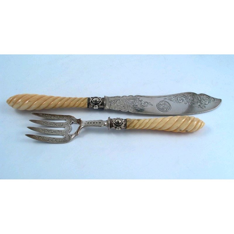 A cased pair of Victorian engraved fish carvers, with wrythen fluted, ivory handles, by J. Gloster, Birmingham 1872.