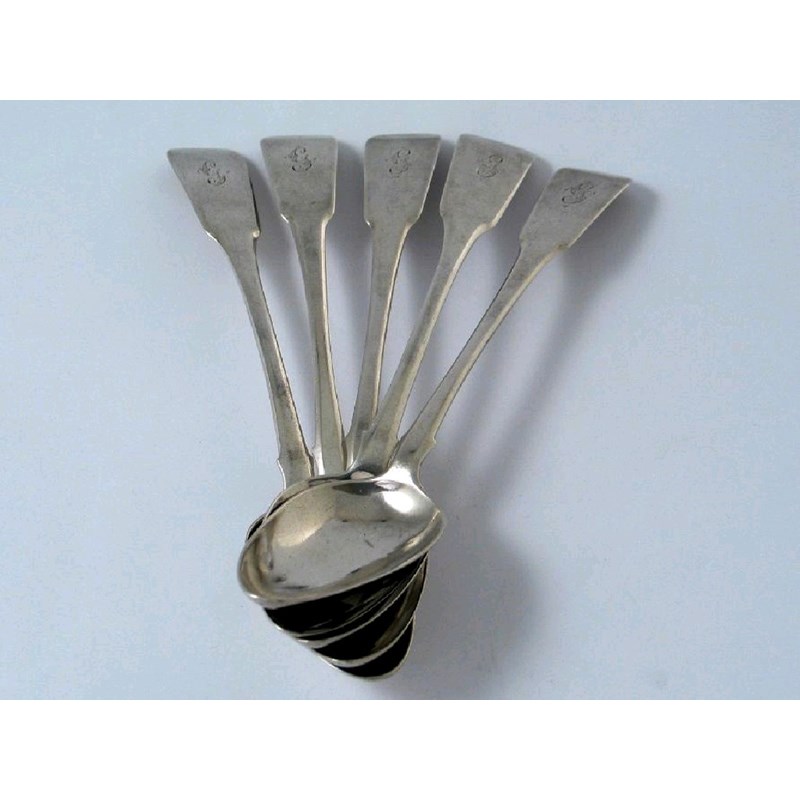 A matching set of five Victorian Scottish provincial fiddle pattern dessert spoons