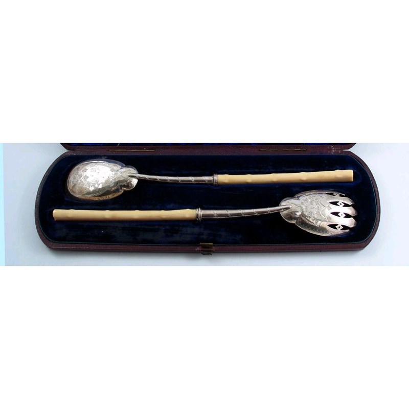 A Victorian cased pair of engraved salad servers, knobbly, ivory handles by Atkin Bros, Sheffield 1875.