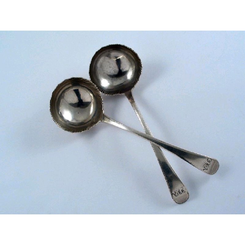 A pair of George III sauce ladles, with feather edging (worn) and feather edged bowls, initialled, by Thomas and William Chomer, London 1765, 3oz.
