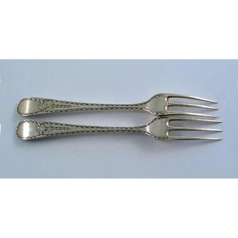 An interesting pair of George III bright cut dessert forks