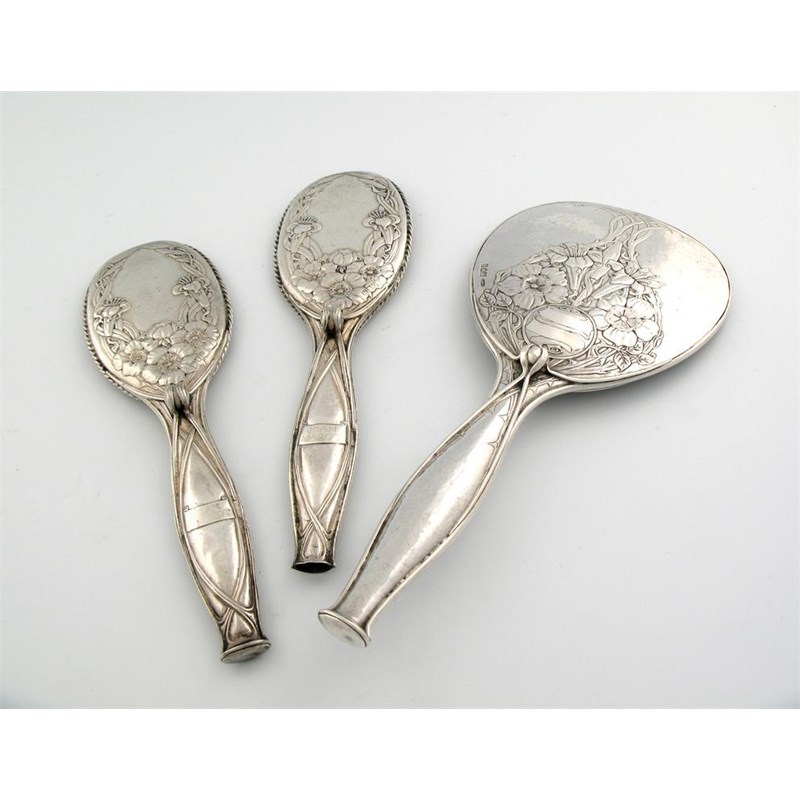 By Omar Ramsden and Alwyn Carr, a silver mirror back and pair of hair brush backs,