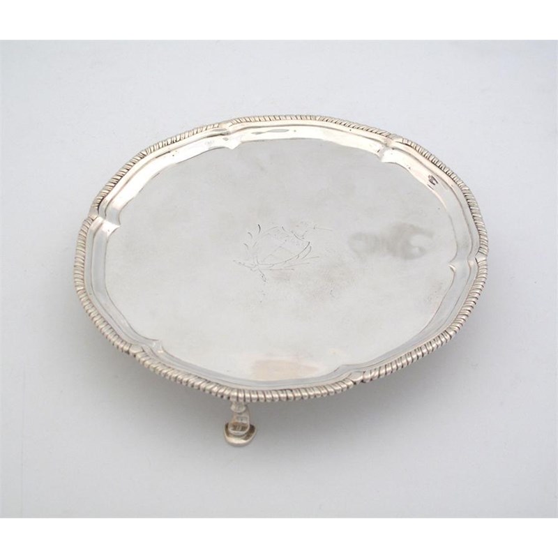 circular form, gadroon border, the centre with an armorial, on three hoof feet, diameter 17.8cm, approx. weight 8oz.