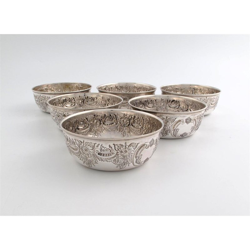 circular form, embossed foliate scroll decoration, diameter 12cm, approx. weight 24oz. (6)