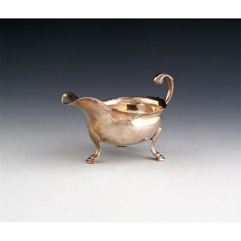 oval form, wavy edge border, leaf capped scroll handle, on three shell capped hoof feet, the underside scratch initialled 'H' over W*E', length 12.4cm, approx. weight 3oz.
