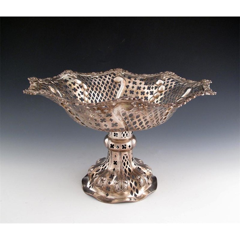 circular tapering form, pierced decoration, embossed scroll and lobed decoration, foliate scroll border, on a raised pierced and lobed circular foot, engraved with a crest and the crowned cipher V.I.R, and dated 'Xmas 1898', diameter 33.3cm, height 21.2cm, approx. weight 37oz.