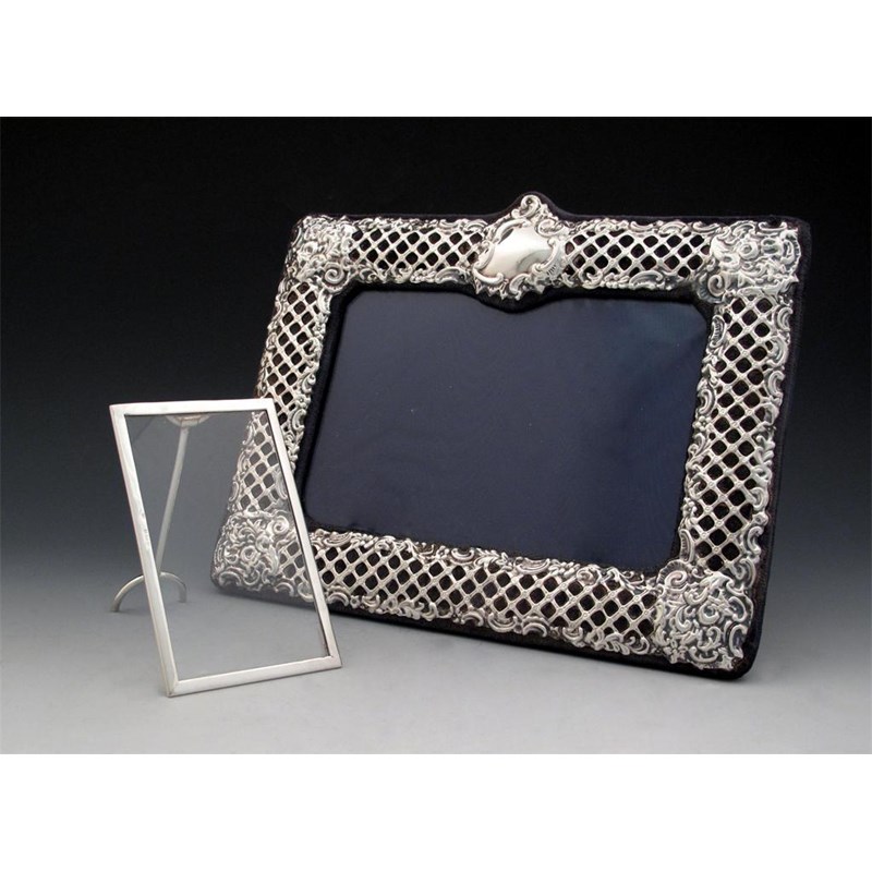 rectangular form, with pierced trellis decoration, velvet easel back, plus an Edwardian silver fame with a strut support, Birmingham 1902. (2)