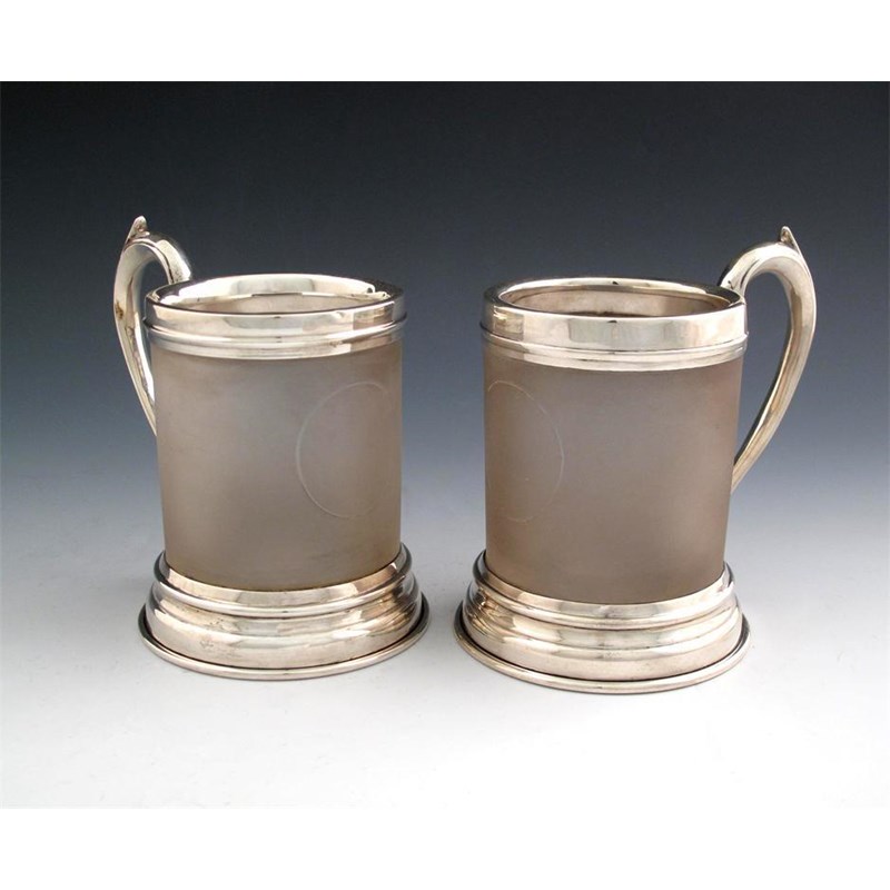 cylindrical form, scroll handles, plain silver mounts, on raised circular bases, height 12.8cm. (2)