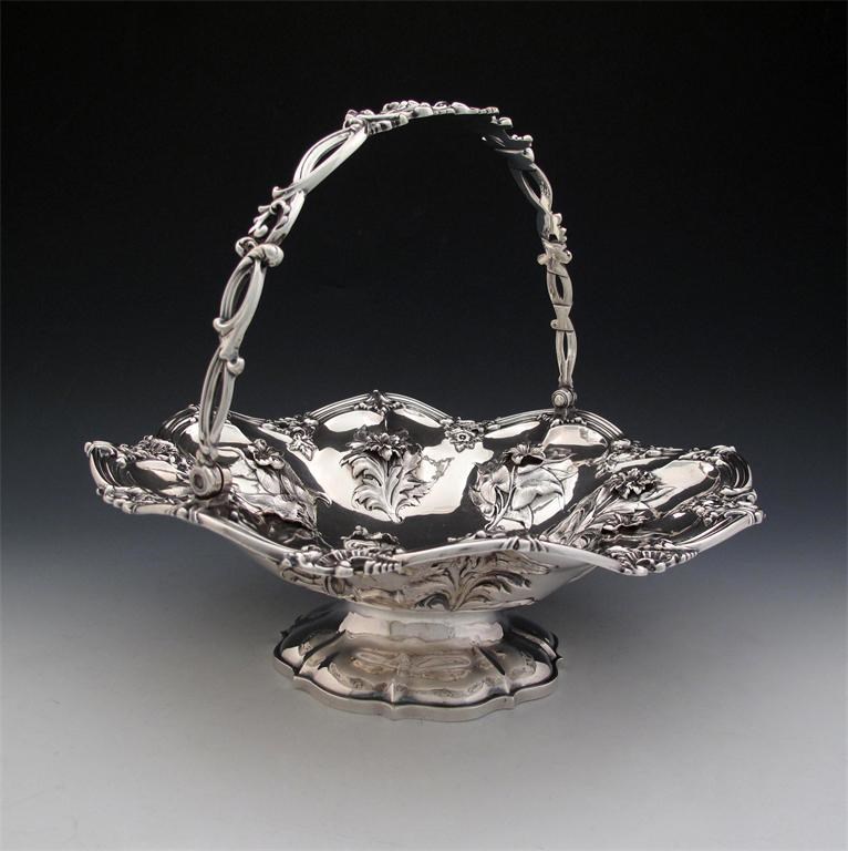 circular lobed form, embossed and applied with flowers, pierced swing handle, pierced foliate scroll border, on a shaped circular foot, diameter 34cm, approx. weight 44oz.