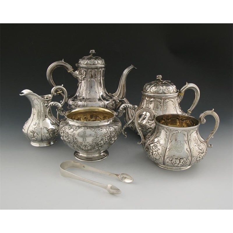 lobed baluster form, embossed foliate decoration, scroll handles, engraved with a monogram, plus a Victorian silver sugar bowl, by Robert Hennell, London 1859, and a pair of sugar tongs, approx. total weight 79oz. (6)