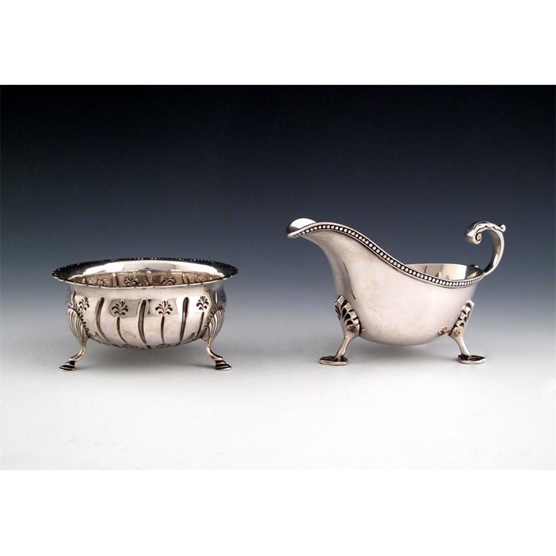 circular form, part fluted decoration, on three hoof feet, punch bead border, plus a silver sauce boat of oval form, Sheffield 1902, approx. weight 12oz. (2)