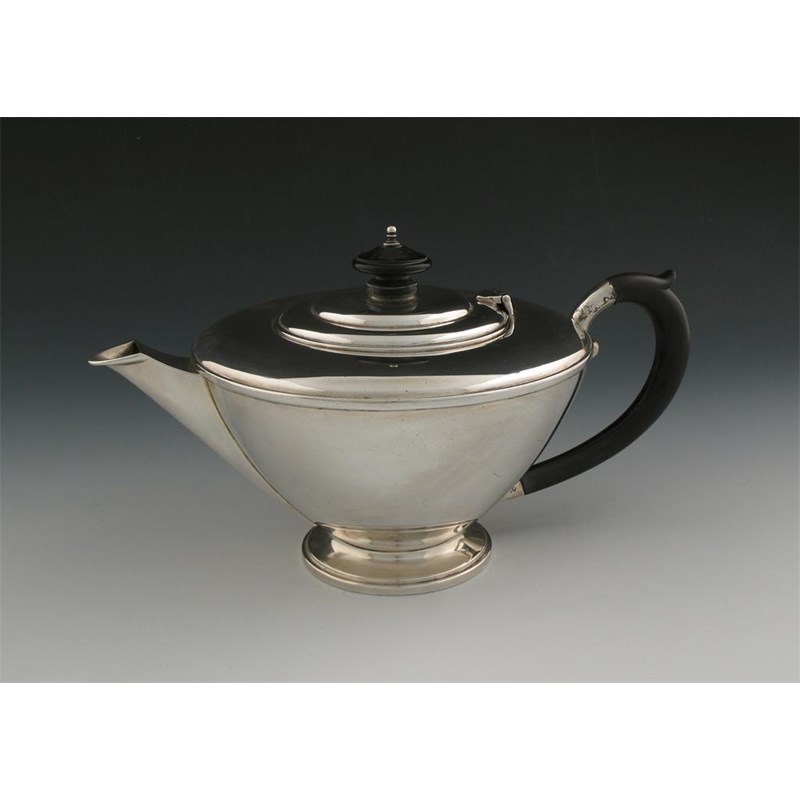tapering circular form, scroll handle, stepped hinged cover on a raised circular foot, length handle to spout 26.5cm, approx. weight 20oz.