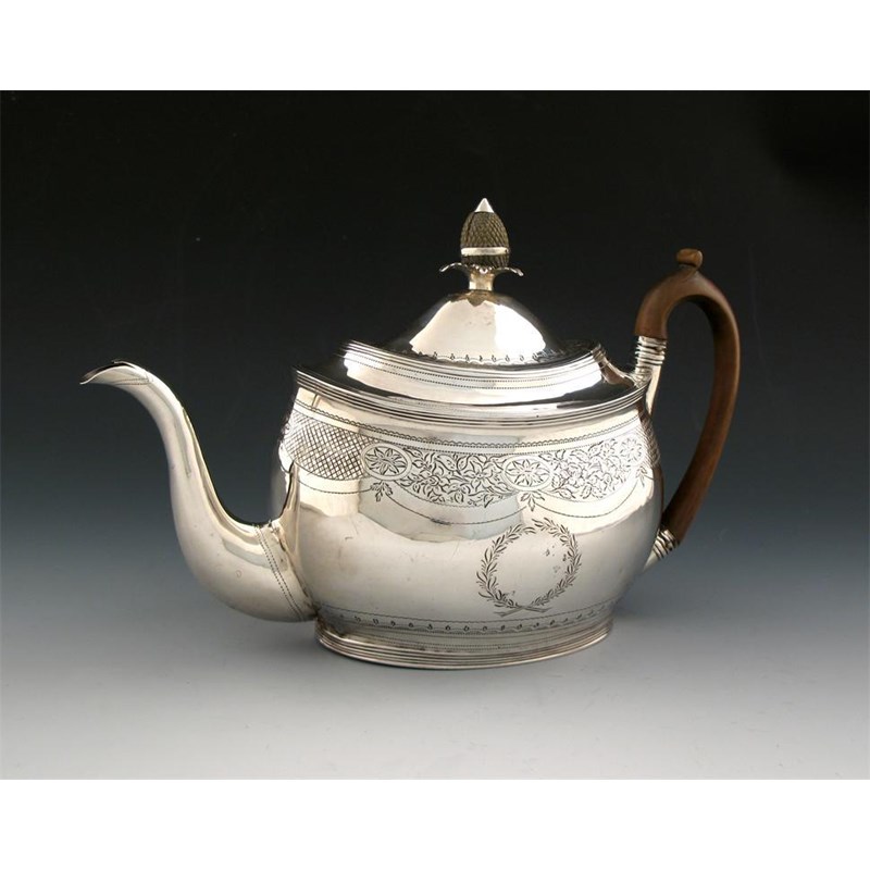 oval form, scroll handle, bright-cut foliate decoration, domed hinged cover with a pineapple finial, length handle to spout 28cm, approx. weight 12oz.