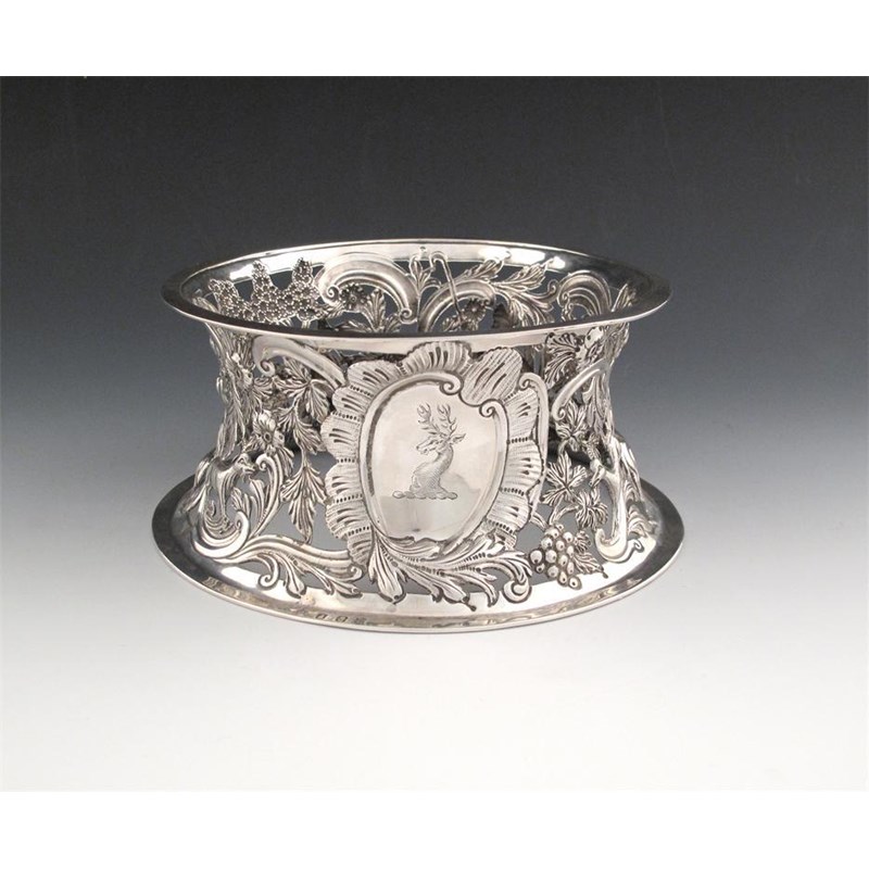 circular form, embossed and pierced with figures, animals and foliate scroll decoration, engraved with a crest, diameter 21cm, approx. weight 12oz.