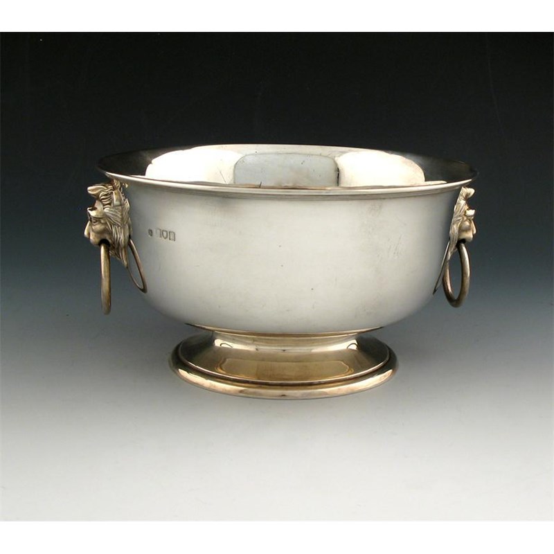 circular form, lion mask drop ring handles, on a circular foot, diameter 17.8cm, approx. weight 13oz.