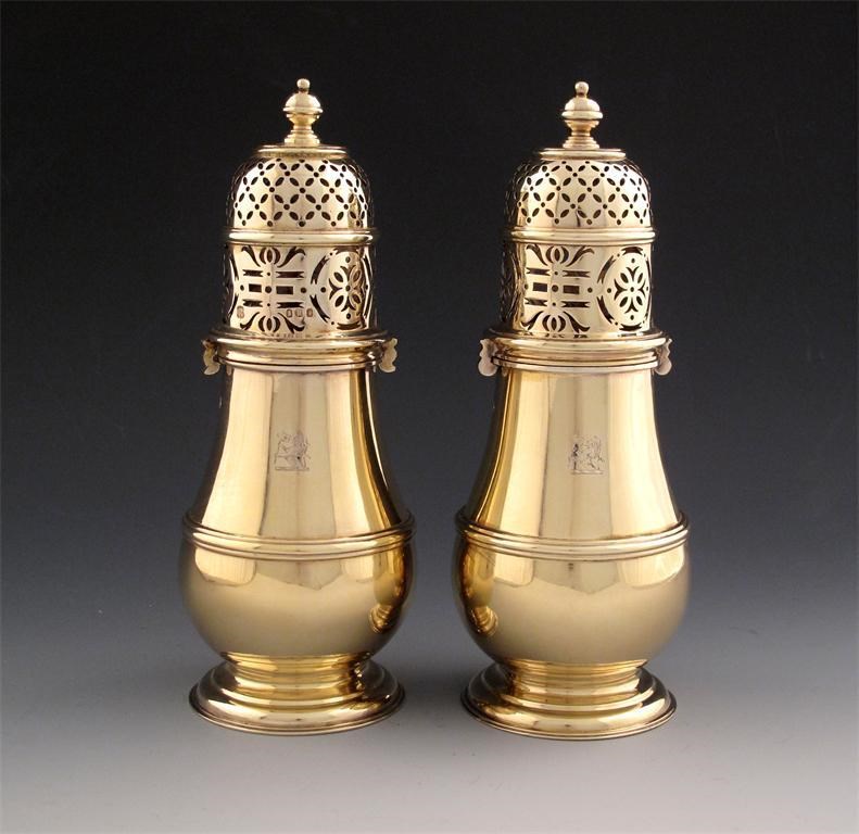 A pair of Edwardian Britannia standard silver-gilt sugar casters,