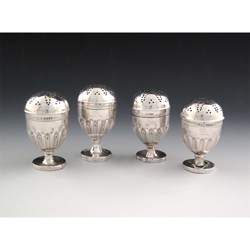 bun form, part fluted decoration, on raised circular bases, engraved with a crest, height 7.8cm, approx. weight 7oz. (4)