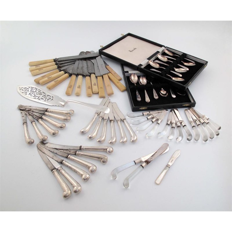 comprising: a fish slice with a pierced blade, two cased sets of six teaspoons, retailed by Harrods, various butter knives with glass handles, fifteen silver handles butter knives and various table and dessert knives. (qty)