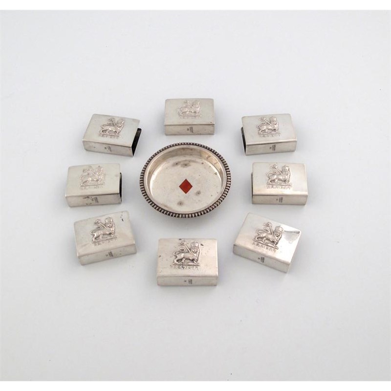 circular form, gadroon border, the centre enamelled with a red diamond, plus eight Ethiopian metalware match box covers. (9)
