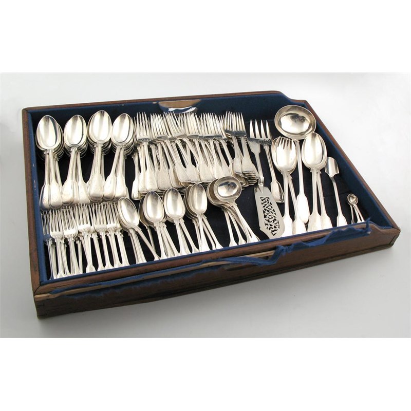 comprising: sixty table forks, thirty-five tablespoons, twenty-three dessert forks, nineteen dessert spoons, a soup ladle, a pair of basting spoons, a set of five sauce ladles, a pair of salad servers (1865), a fish slice and fork (1865), a stilton scoop (1865), and three salt spoons, on a wooden cutlery tray, approx. weight 405oz. (qty)