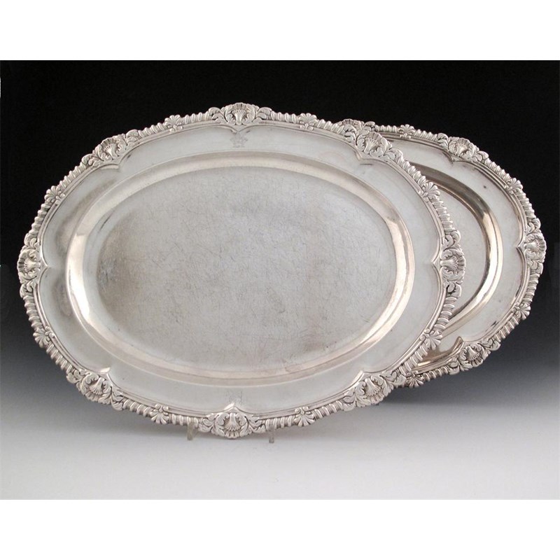 oval form, gadroon and shell border, engraved with two crests, one with scratch weight to underside '71oz, 17dwts', length 44.8cm, approx. weight 139oz. (2)