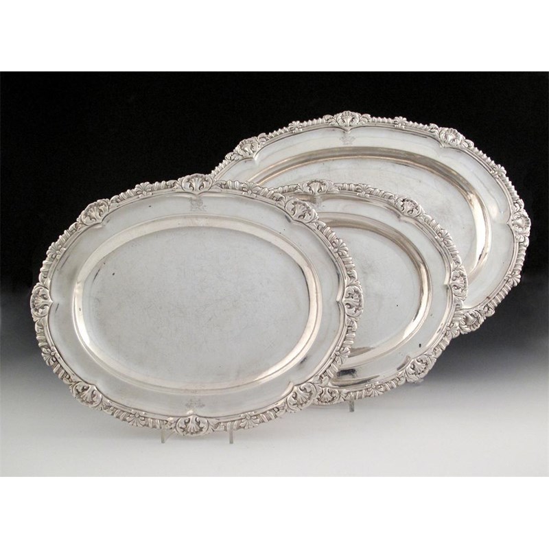 oval form, shell and gadroon borders, engraved with two crests, the larger platter with scratch weight '76oz 8dwt', one of the smaller ones with scratch weight '40oz 2dwt', length of larger 46.8cm, , length of smaller 33.3cm, approx. total weight 148oz. (3)