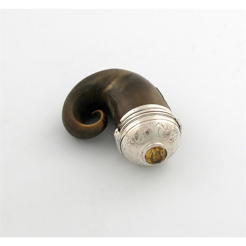 the domed hinged cover with engraved decoration and set with a yellow citrine, the front with a vacant cartouche shield, length 8cm.