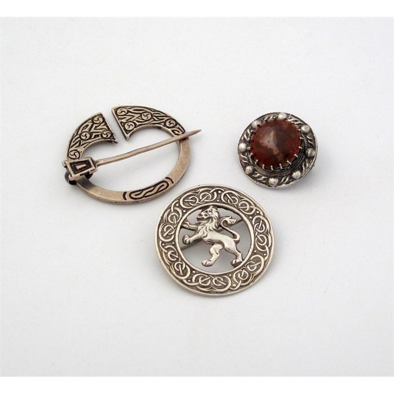 comprising: one of circular form mounted with a hard stone, one with a lion and one with Celtic design. (3)