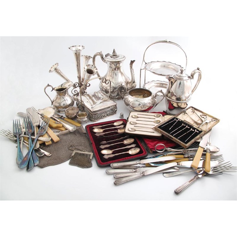 comprising: silver items, a cased set of six teaspoons, a cased set of six coffee spoons, a set of six cased cocktail sticks, two pairs of tongs, plus a thimble and a Chinese salt and mustard pot, electroplated items, a cake stand, an epergne, a three piece coffee set, a sardine dish and a small quantity of flatware. (qty)
