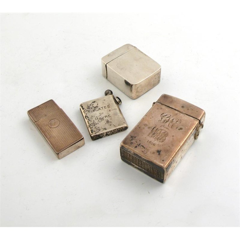 rounded rectangular form, plus a silver snuff box with engine turned decoration, another box and a tinder striker. (4)
