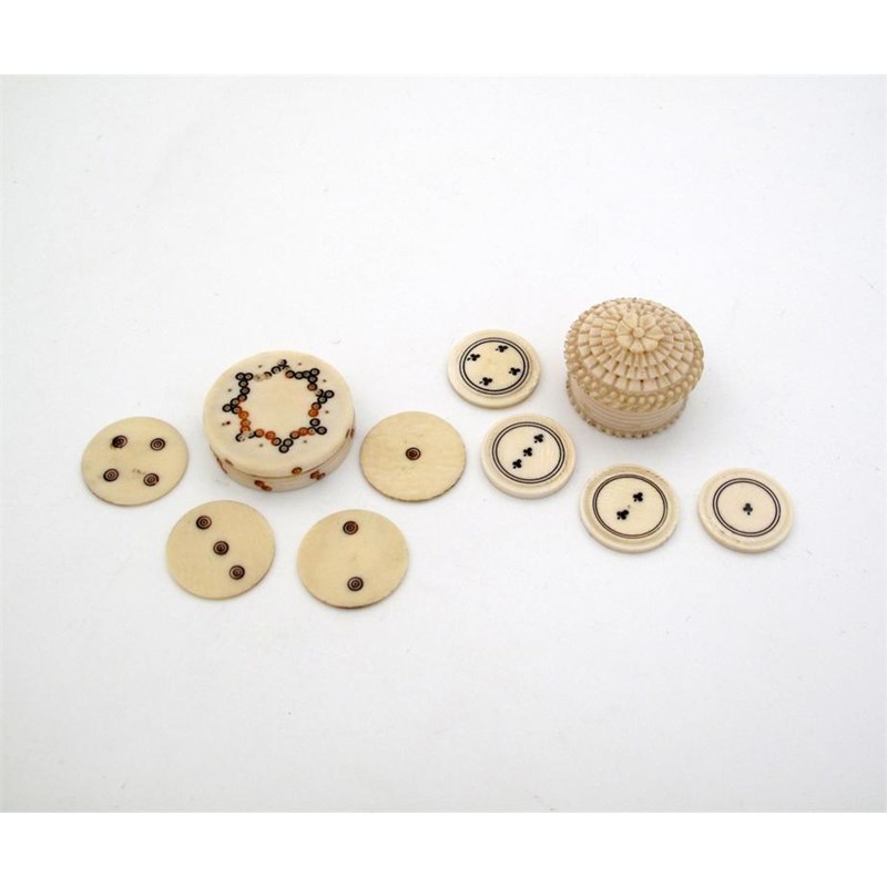 circular form, carved foliate cover, fluted sides, diameter 2.8cm, plus a 19th century ivory counter box and four counters, circular form, with pique and lacquered decoration. (2)